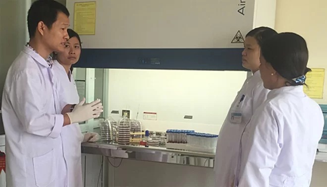 Tiến sĩ Trung hướng dẫn các bác sĩ bệnh viện tuyến dưới xét nghiệm vi khuẩn Whitmore. Ảnh: T.T