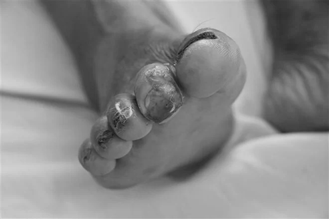 Ngón chân của ông Hà bị loét là vị trí để vi khuẩn Whitmore xâm nhập vào cơ thể. Ảnh: Song Hào.