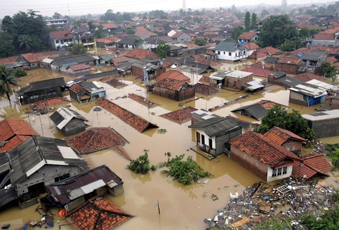 Nước lũ lên tận mái nhà ở đông Jakarta ngày 4/2/2007. Ảnh: Reuters.