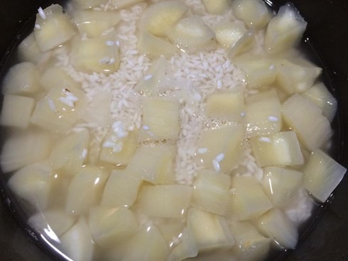 - Cho sắn đã luộc sơ vào nồi cơm điện trộn chung với gạo, thêm nước sâm sấp mặt gạo và cho thêm 1/2 thìa cà phê muối vào nồi.