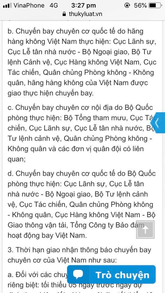Điều 7 và 8 quy định 4 văn phòng “tứ trụ” có thẩm quyền Thông báo chuyến bay chuyên cơ bằng văn bản với nội dung: đối tượng được phục vụ và số lượng, gửi tới: Cục lãnh sự, Cục lễ tân nhà nước - bộ Ngoại giao, bộ tư lệnh Cảnh vệ, Cục hàng không VN, hãng HK được giao bay chuyên cơ.