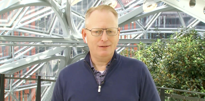 Dave Limp sử dụng tai nghe Airpods khi giới thiệu sản phẩm mới của Amazon. Ảnh: Twitter.