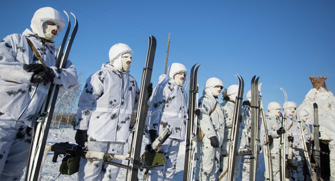 Lực lượng đặc biệt của quân đội Nga (Spetsnaz) với trang phục và các trang bị để hoạt động trong điều kiện thời tiết lạnh giá. Ảnh: Sputnik.