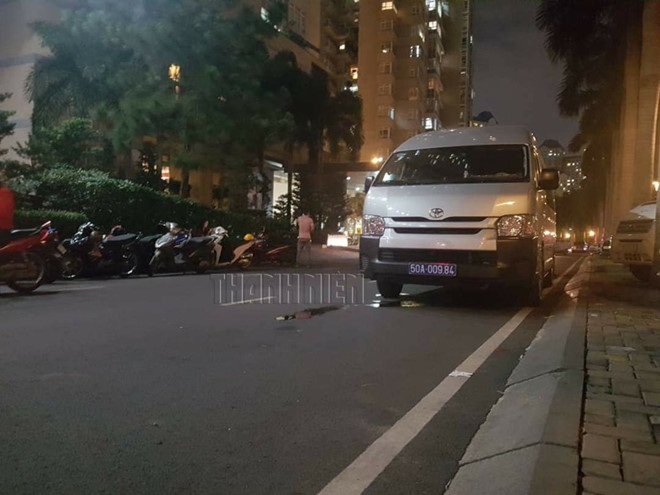 Một xe biển xanh đậu trước chung cư, nơi công an đang khám xét nơi ở của bị can Lâm Hoàng Tùng.