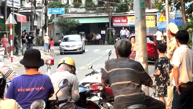 Lực lượng chức năng phong toả tuyến đường trước căn nhà bị khám xét.