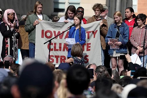 Thunberg phát biểu trong cuộc biểu tình vì môi trường tại thành phố Iowa, bang Iowa, Mỹ hôm 4/10. Ảnh: Reuters