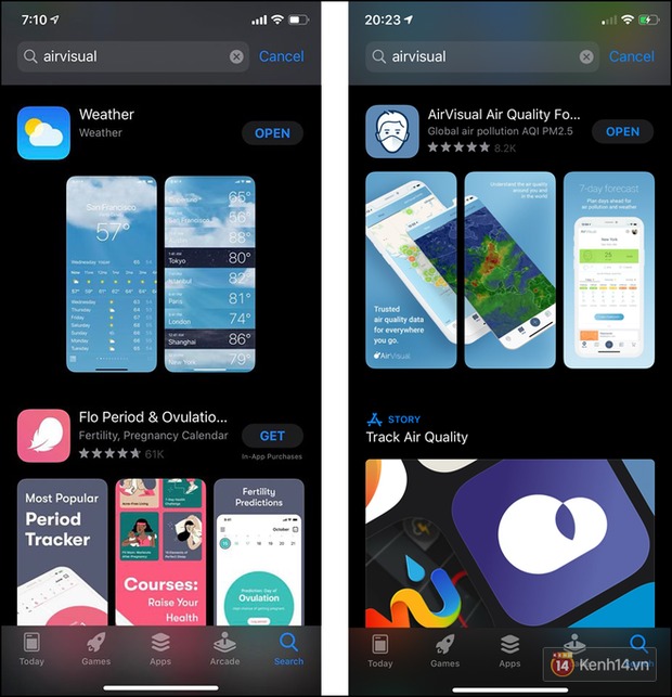 AirVisual không thể được tìm thấy trên AppStore vùng Việt Nam (trái) - vẫn hiện lên bình thường khi chuyển vùng quốc gia khác như Mỹ (phải). Tình trạng tương tự xảy ra với Android.