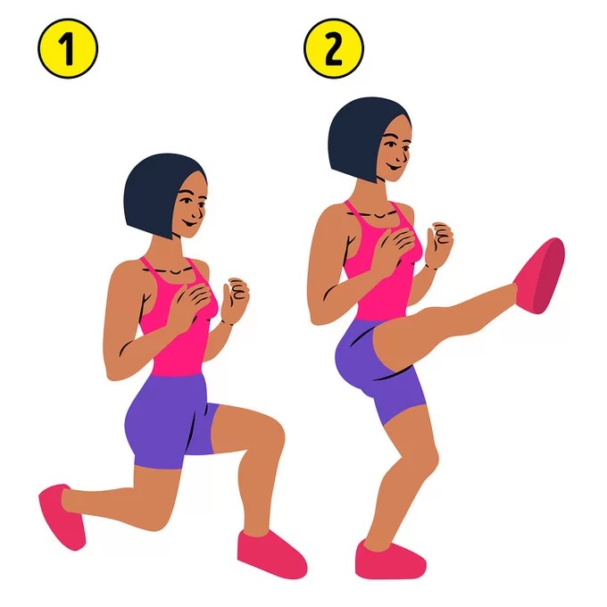 Đứng thẳng, hai khuỷu tay gập tự do theo hông, bước một chân lên phía trước, hạ thấp trọng tâm sau đó rút chân sau lên đá thẳng về phía trước. Lặp lại động tác 10 lần mỗi chân.