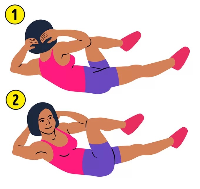 Nằm trên thảm, nâng cao đầu, hai tay để sau gáy, nâng cao hai chân. Thực hiện động tác rút gối vặn người lần lượt mỗi bên 10 lần.