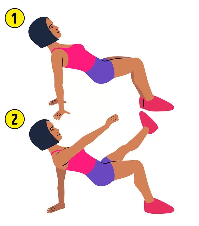 Chuẩn bị ở tư thế chống đẩy ngược, đá chân tay ngược bên lên cao liên tục 10 lần mỗi bên.