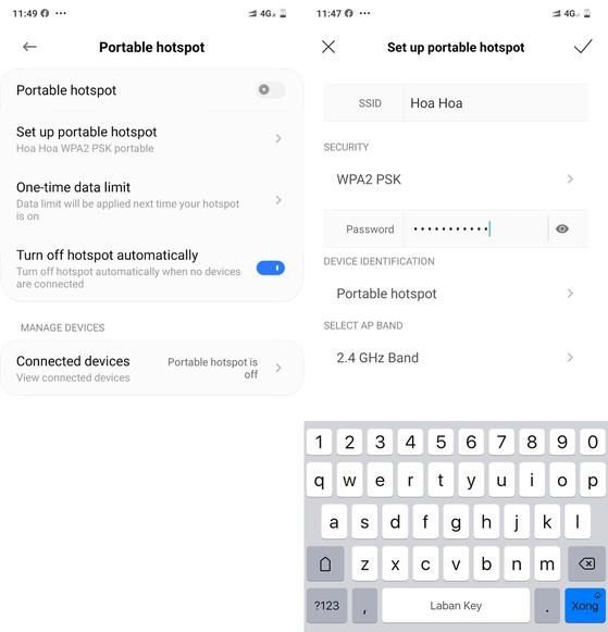 Tiếp theo, người dùng chỉ cần bấm vào tùy chọn Set up portable hotspot (thiết lập điểm phát sóng Wi-Fi di động), đặt tên mạng (SSID) và mật khẩu tương ứng. Để đảm bảo an toàn, bạn hãy chọn giao thức bảo mật WPA2 PSK. Sau đó, quay ngược lại menu trước đó và kích hoạt tùy chọn Portable hotspot (điểm phát sóng Wi-Fi di động) để tạo điểm truy cập Wi-Fi.