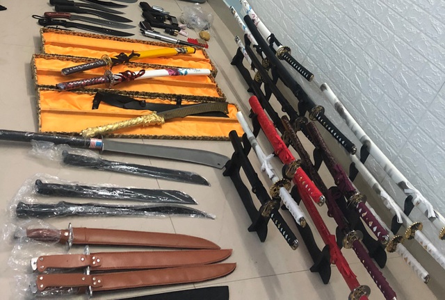 Qua kiểm tra, công an xác định, số vũ khí mà Ánh cất giấu là các loại vũ khí thô sơ và công cụ hỗ trợ gồm: 45 cây dao lê, mã tấu; 3 cây súng bắn đạn bi; 6 bịch đạn bi; 8 bình xịt hơi cay (loại 110ml)…