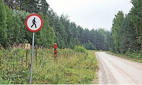 Tấm biển cấm đi bộ và cột mốc biên giới Nga màu đỏ xanh bên đường. Ảnh: Jassu Hertsmann.