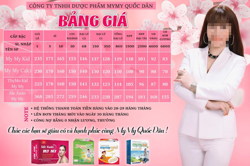 Trên trang facebook có tên “MyMy Quốc Dân”, bà Mỳ thường xuyên tổ chức các buổi hội nghị hoành tráng, đào tạo kỹ năng lôi kéo khách hàng, dạy làm video quảng cáo. Bà này luôn phô trương sự giàu có với ảnh chụp nhà lầu, xe hơi, cuộc sống giàu sang, thu nhập tiền tỉ chỉ nhờ chịu khó bán các sản phẩm do công ty mình sản xuất, phân phối.