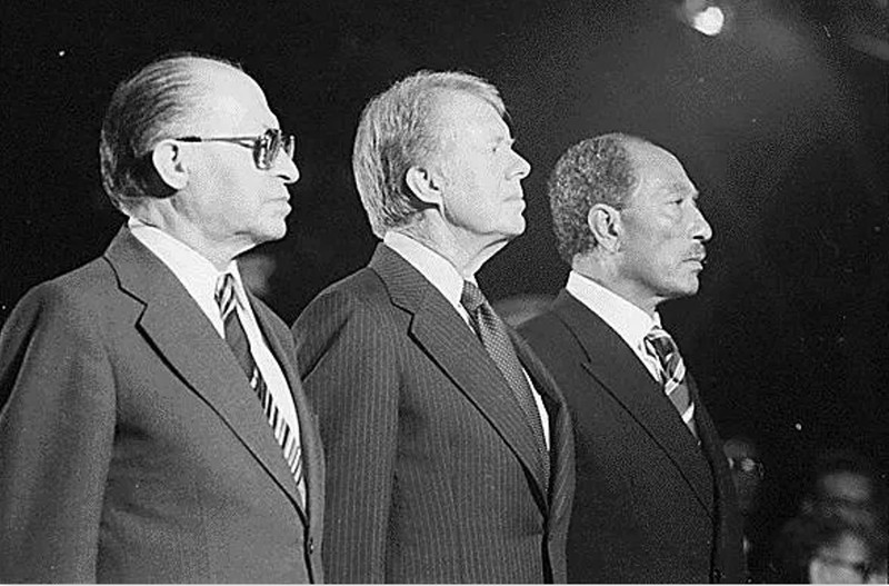 Tổng thống Mỹ (giữa) và Thủ tướng Israel (trái), Tổng thống Ai Cập (phải) gặp nhau ký kết Hiệp ước hòa bình Trại David sau Chiến tranh Ngày lễ Rửa tội năm 1973