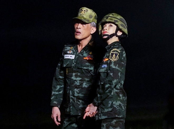 Hình ảnh vua Maha Vajiralongkorn với Hoàng quý phi Sineenat Wongvajirapakdi trước khi bị tước hết mọi chức vị. Ảnh: Hoàng gia Thái Lan.
