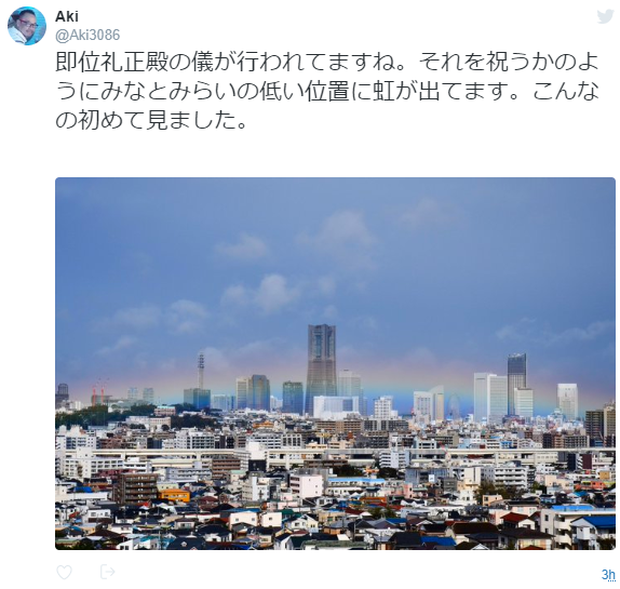 Không chỉ là một sự kiện được người dân ngóng chờ mà vào thời điểm Nhật hoàng chuẩn bị bài phát biểu tiếp nhận ngai vàng, người dân nước này đã phát hiện ra những sự trùng hợp đến ngỡ ngàng. Vào khoảng 13h15', người dân thành phố Tokyo đã nhìn thấy một dải cầu vồng lớn, khá rõ nét xuất hiện. Cùng với sự xuất hiện của dải cầu vồng, núi Phú Sĩ cũng đã đón đợt tuyết rơi đầu tiên của mùa thu năm nay.