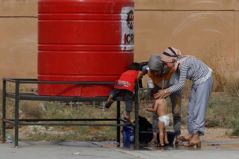 Người phụ nữ tắm cho con nhỏ dưới vòi nước trong một ngôi trường công ở Hasakah.