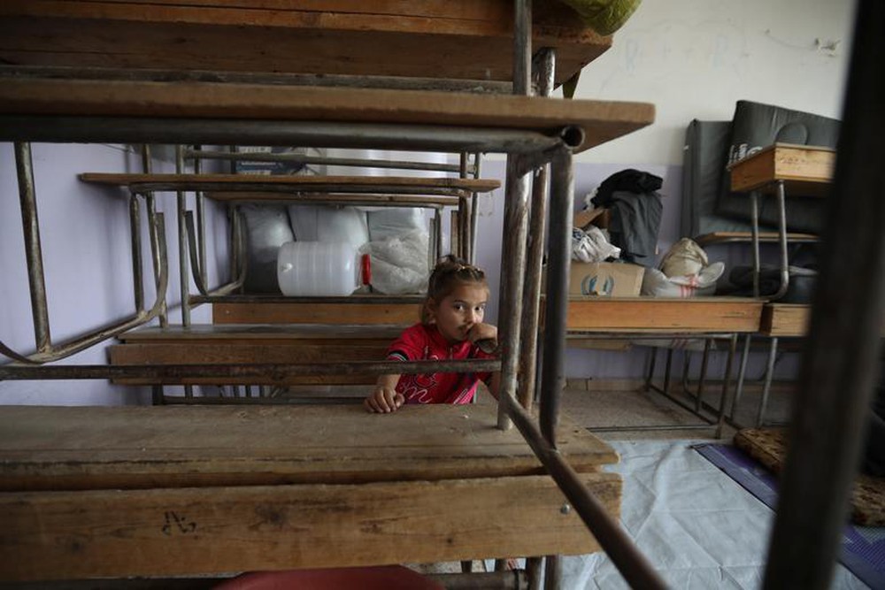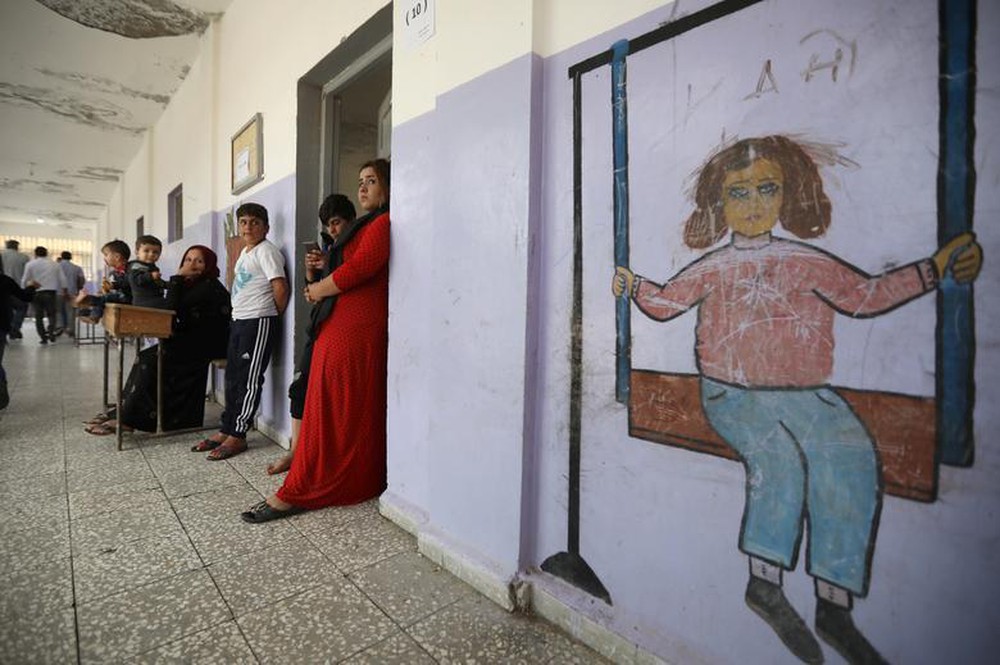 Các gia đình người Kurd và Ảrập lánh nạn trong một ngôi trường công ở Hasakah.