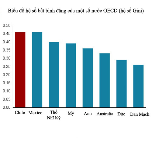 Chile là nước có chỉ số bất b́nh đẳng cao nhất trong số các quốc gia thành viên Tổ chức Hợp tác và Phát triển Kinh tế (OECD). "T́nh trạng bất b́nh đẳng sâu sắc đă diễn ra tại Chile suốt nhiều năm", Javier Sajuria, giảng viên cao cấp về chính trị tại Đại học Queen Mary ở London, Anh, cho biết, nói thêm rằng dữ liệu cho thấy mức độ bất b́nh đẳng đang giảm nhưng "không đủ nhanh".