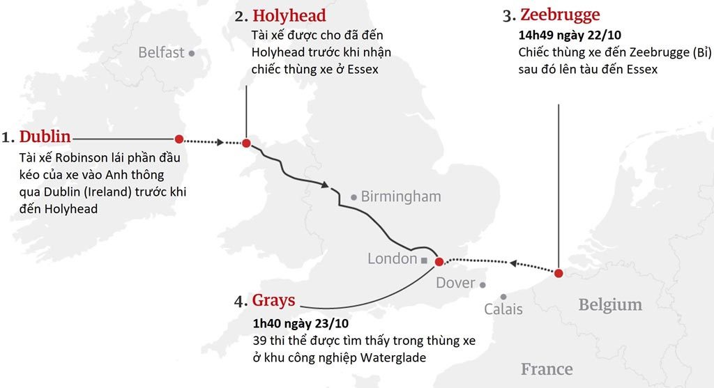 Hành trình chết chóc của xe tải chở 39 người di cư từ Bỉ vào Anh. Đồ họa: Guardian.