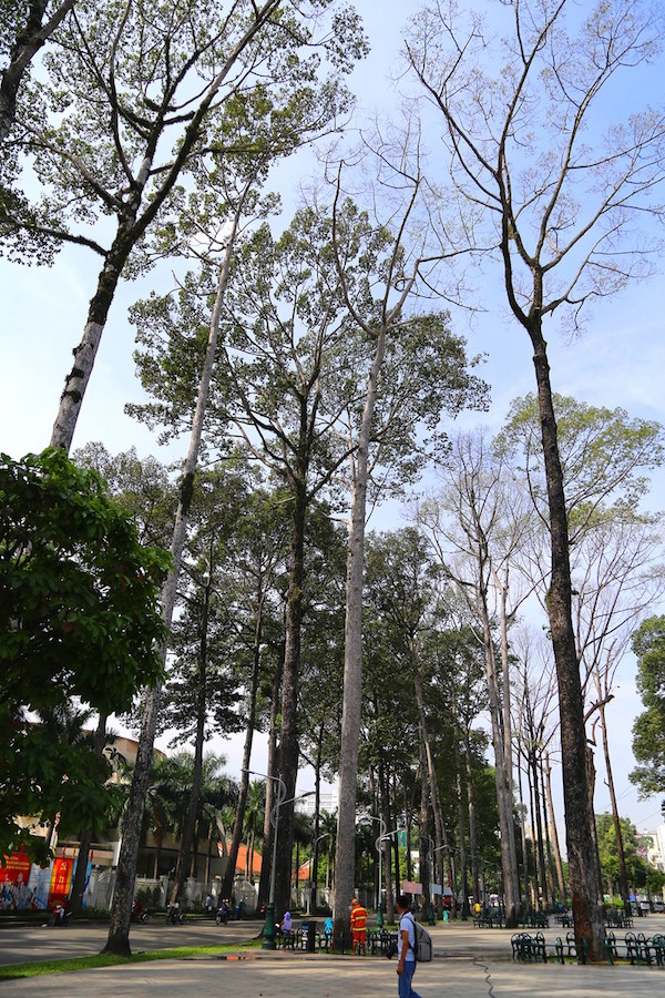 Có khoảng 10 cây cổ thụ thuộc họ dầu, lim xẹt đường kính khoảng 50 cm trụi lá, chết đứng giữa công viên.