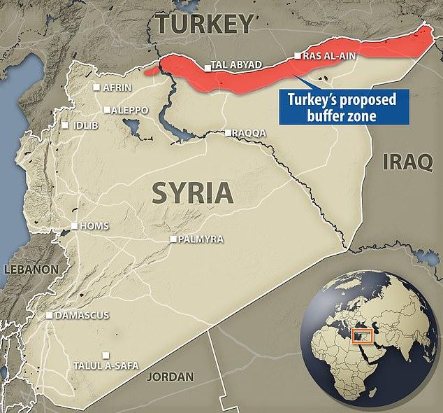 Đường màu đỏ trên bản đồ là nơi Thổ Nhĩ Kỳ muốn thiết lập khu vực vùng đệm an toàn giữa biên giới của họ với Syria