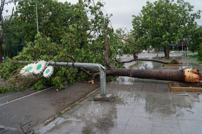 Cột điện, cây xanh bị gió bão quật đổ trên đường phố Quy Nhơn.