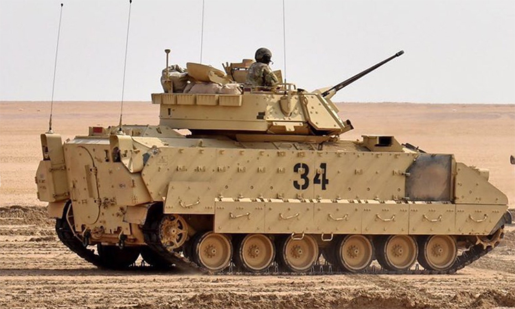 Thiết giáp M2A2 Bradley thuộc lữ đoàn cơ giới số 30 của Vệ binh Quốc gia Mỹ tới tỉnh Deir ez-Zor, Syria ngày 31/10 để bảo vệ các mỏ dầu tại đây. Ảnh: US Armed Forces.