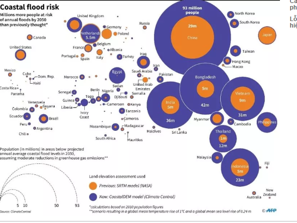 Đó là cảnh báo đáng sợ. Cho dù nhân loại có kiềm chế khí thải carbon mạnh mẽ như thế nào, các nhà khoa học vừa công bố dữ liệu mới cho thấy có 300 triệu người các khu vực ven biển trên thế giới, trong đó có Việt Nam sẽ dễ bị tổn thương vào năm 2050. Nguyên nhân là lũ lụt trở nên tồi tệ hơn do biến đổi khí hậu, gấp ba lần so với dữ liệu trước đó.