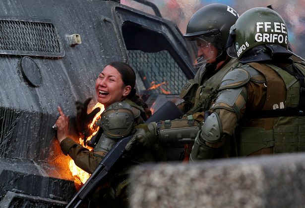 Hai nữ sĩ quan cảnh sát đặc nhiệm ở Santiago, Chile đã bị kẻ biểu tình ném bom xăng và bốc cháy khiến họ thét lên đau đớn và phải nhập viện trong tình trạng nguy kịch.