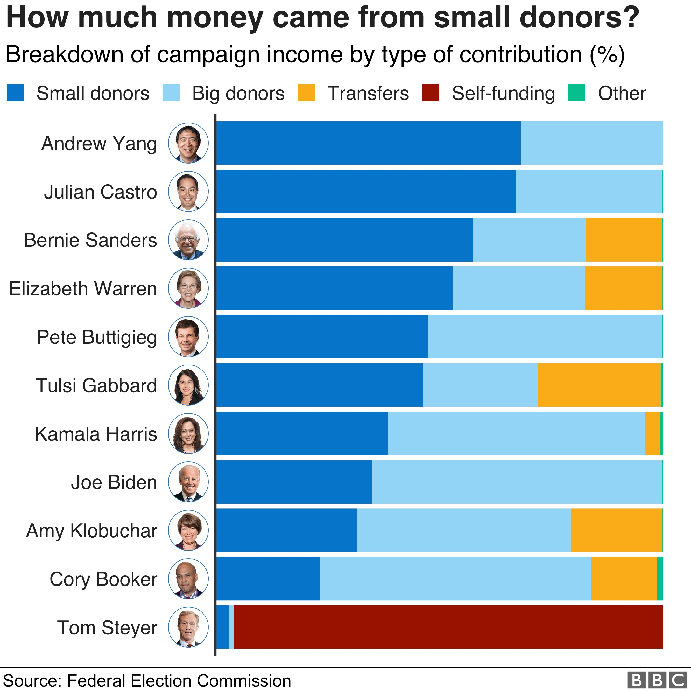 Bernie Sanders và Elizabeth Warren cũng được các nhà tài trợ nhỏ hỗ trợ, nhưng tỷ lệ này của họ nhỏ hơn vì hai người này chuyển tiền từ tài khoản chiến dịch tranh cử vào Thượng viện của họ sang chiến dịch tranh cử tổng thống.