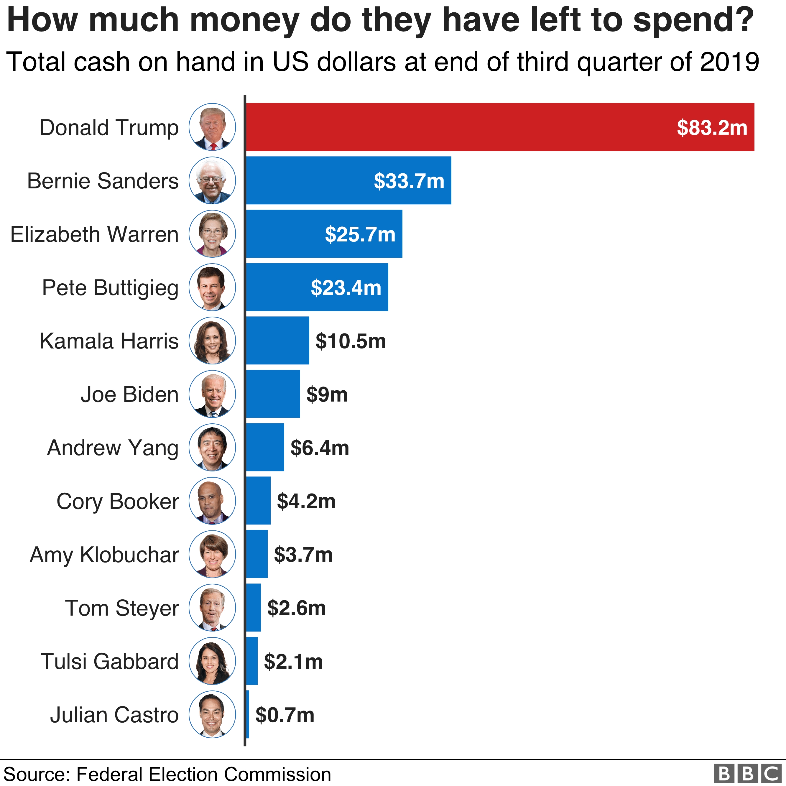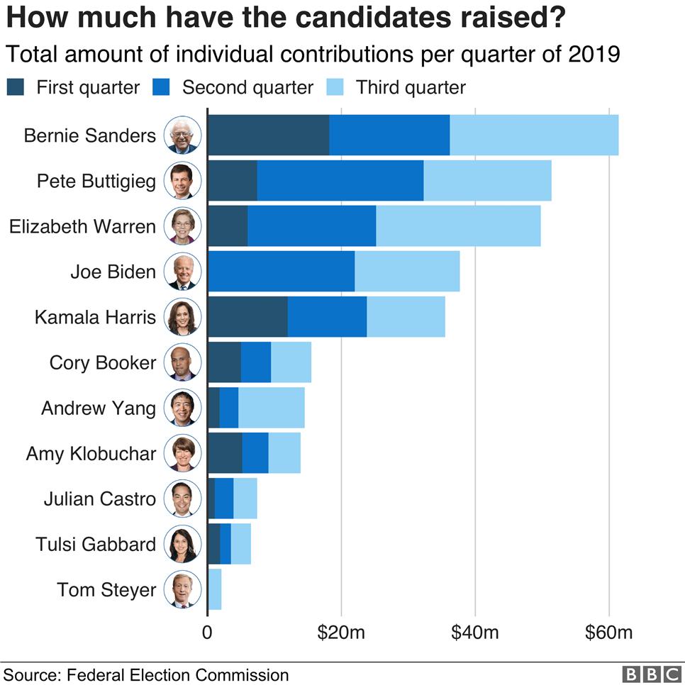 Một dấu hiệu đáng lo ngại cho Joe Biden là ông kết thúc quý thứ ba chỉ với 9 triệu đôla trong ngân hàng, một số tiền rất nhỏ cho một ứng cử viên dẫn đầu đang phải đối mặt với một đối thủ mạnh mẽ. Ngược lại, các đối thủ theo sát ông như Sanders, Warren và Buttigieg - tất cả đã bước vào quý IV năm 2019 với số tiền rất khả quan.