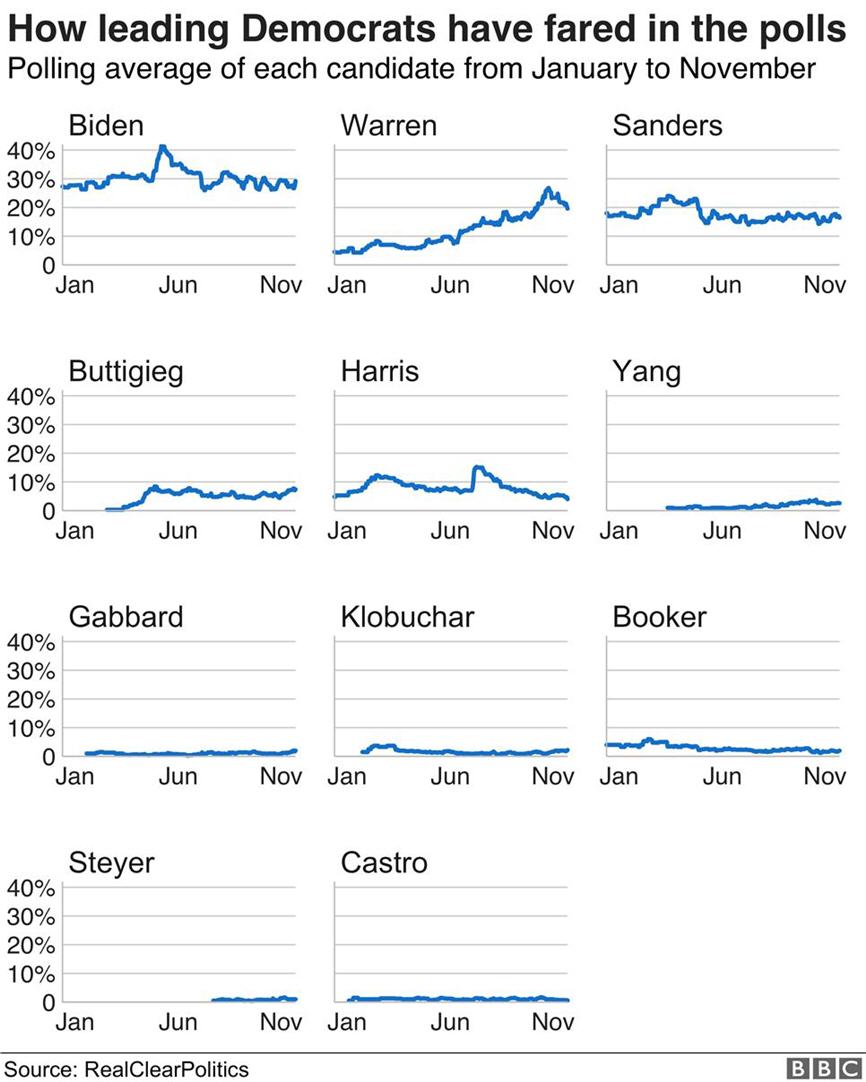 Khi bạn nhìn vào số người ủng hộ họ trong các cuộc khảo sát trong biểu đồ bên dưới, dễ dàng nhận thấy bà Warren là ứng cử viên đang có đà rất lớn, từ mức trung bình khoảng 5% trong tháng 1, đến tháng 11 bà đã đạt 20% người ủng hộ.