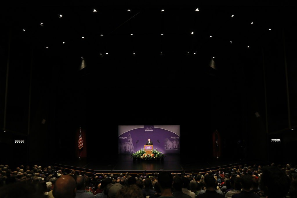Ông Pompeo trong một bài thuyết trình ở Đại học Bang Kansas tháng 8. Các chuyến đi thường xuyên tới Kansas càng khiến dư luận đồn đoán ông có thể tranh cử vào Thượng viện. Ảnh: New York Times.