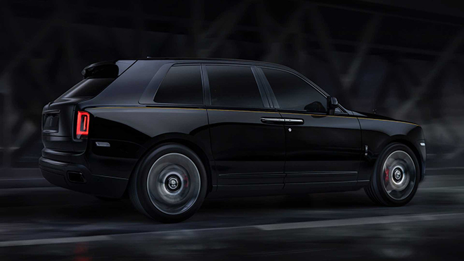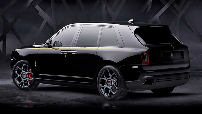 Bên cạnh lớp sơn ngoại thất màu đen được đánh bóng thủ công, chiếc Cullinan Black Badge còn được trang bị lưới tản nhiệt, nẹp cửa sổ, ống xả bằng crom tối màu. Biểu tượng Spirit of Ecstasy ở phần đầu xe được chế tác bằng crom đen bóng. Trong khi đó, bộ mâm đúc 22 inch 2 tông màu bạc và đen, kẹp phanh màu đỏ cùng đường coachline vàng tươi tương phản dọc thân xe khiến chiếc siêu SUV Cullinan Black Badge trở nên nổi bật hơn.