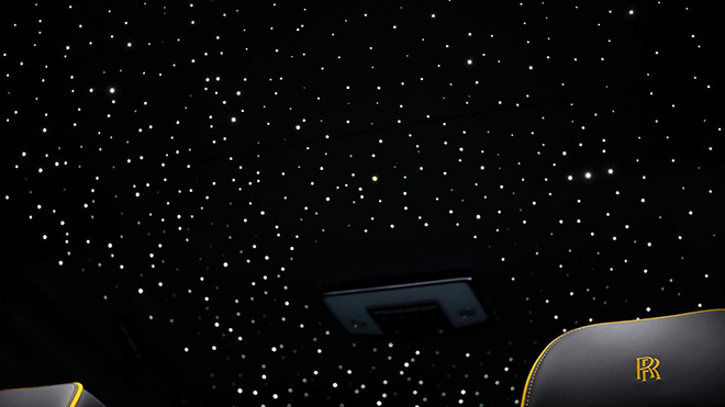 Khoang nội thất xa xỉ của Cullinan Black Badge tiếp tục lấy màu đen làm tông màu chủ đạo kết hợp với những điểm nhấn màu vàng tương phản. Nhiều chi tiết được dệt từ sợi carbon ốp trong không gian nội thất của xe tạo ra hiệu ứng ba chiều độc đáo. Đáng chú ý, phần trần xe mô phỏng bầu trời sao của Rolls-Royce cũng đã xuất hiện trên mẫu SUV siêu sang như một chiến binh việt dã.