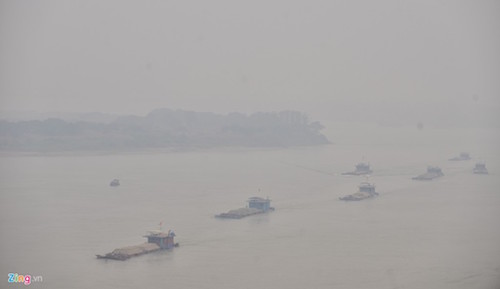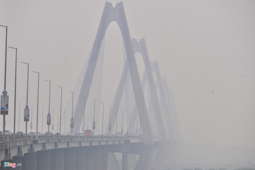 Mặc dù đã đến trưa nhưng bầu trời Hà Nội vẫn chìm trong mù mịt. Lúc 11h, đứng đầu cầu Nhật Tân vẫn không nhìn rõ cuối cầu.
