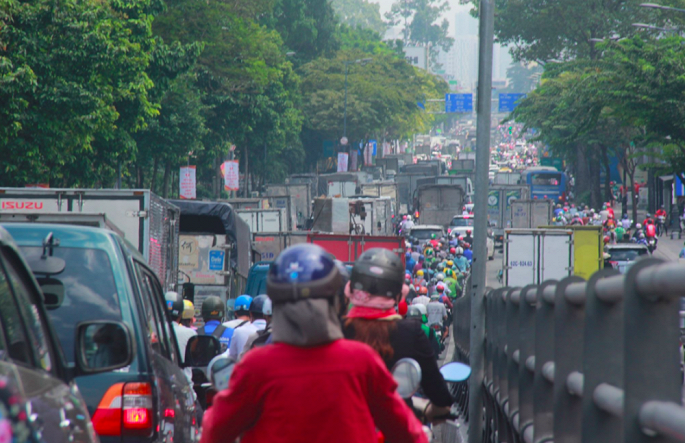 Nhiều xe máy bị bủa vây bởi ôtô xung quanh, không thể thoát ra.