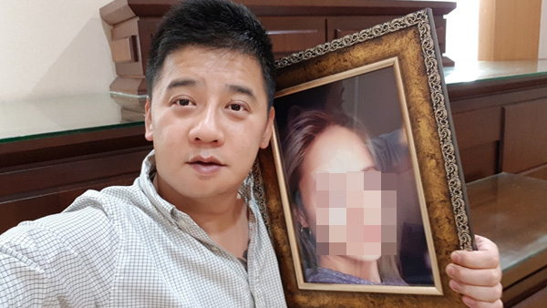 Lee chụp cùng ảnh của vợ quá cố.