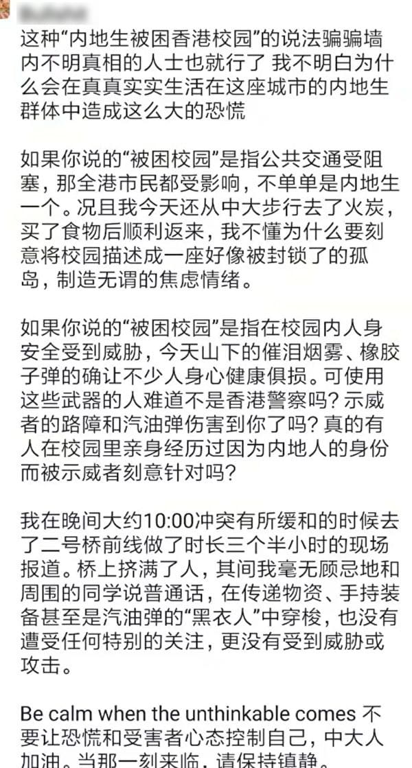 “Đại Lục cảm giác tuyệt vọng là không đúng”. Theo sinh viên này cho biết, hiệu trưởng, cựu sinh viên, công nhân và bạn học đều giúp đỡ, không phải họ đơn độc không ai giúp đỡ. Sinh viên này cũng cho biết cậu không muốn Đại học Trung văn bị truyền thông bôi nhọ, không muốn công chúng bị ảnh hưởng bởi bầu không khí hoảng loạn trực tuyến.