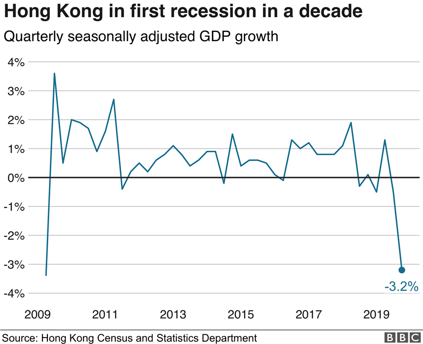 Số liệu công bố hôm 15/11/2019 cho hay sau nhiều tháng biểu tình chống chính phủ, kinh tế Hong Kong lần đầu rơi vào suy thoái sau một thập niên.