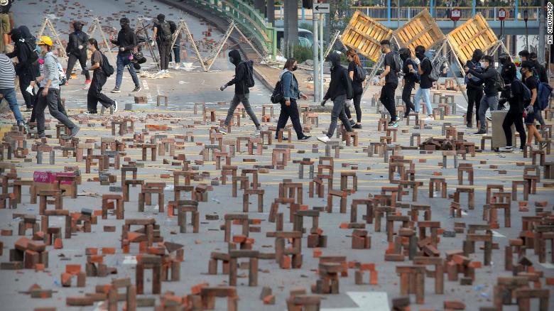 Hàng rào bằng gạch được tạo ra bởi những người biểu tình trước lối đi vào trường Đại học bách khoa Hồng Kông (ảnh: CNN)