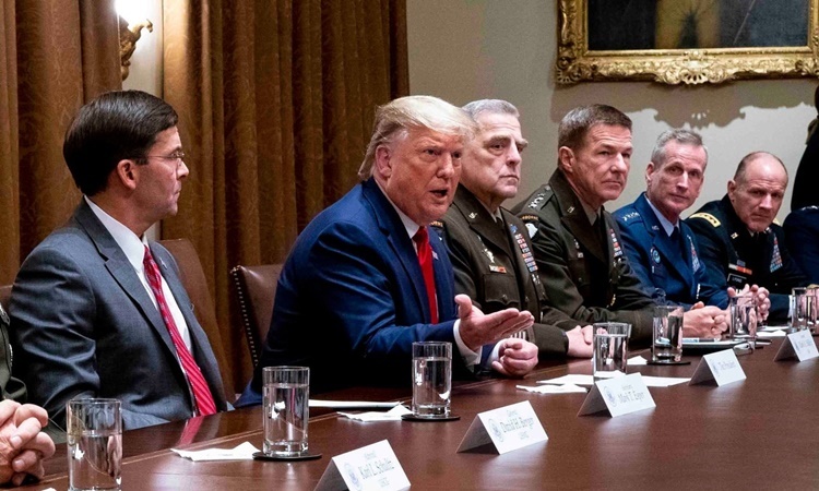 Tổng thống Trump trong một cuộc họp với các lãnh đạo quân sự ở Nhà Trắng hồi tháng trước. Ảnh: NYTimes.