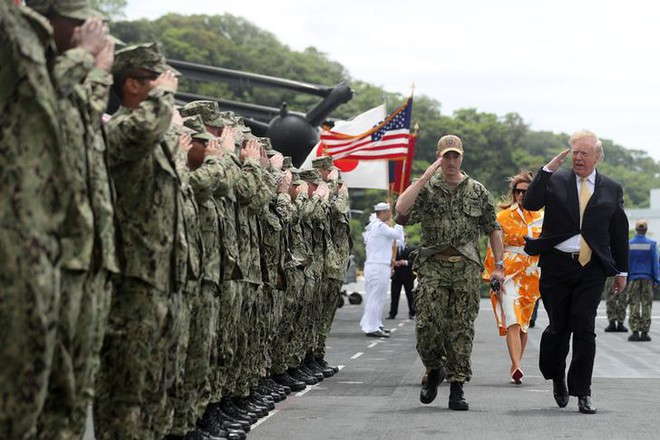 Tổng thống Trump chào binh lính Mỹ tại Nhật Bản hồi tháng 5. Ảnh: Reuters.