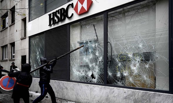Người biểu tình tấn công một trụ sở của ngân hàng HSBC tại Paris (Ảnh: Getty)