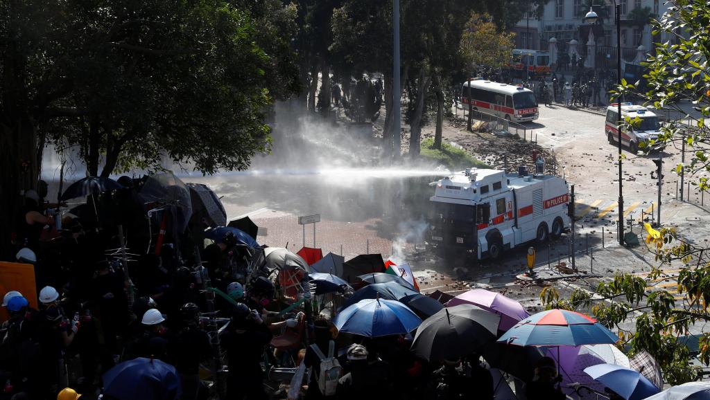 Cảnh sát dùng vòi rồng giải tán người biểu tình trước Đại học Bách Khoa Hoa Kỳ ngày 17/11/2019. Reuters