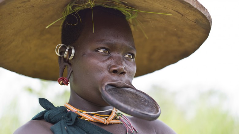 Với một phụ nữ Mursi hoặc Suri ở Ethiopia, môi căng ra như thế này biểu thị sự trưởng thành của phụ nữ, báo hiệu rằng cô ấy đã đến tuổi sinh đẻ. Quá trình này bao gồm việc loại bỏ hai răng cửa dưới trước khi xỏ lỗ để một chiếc đĩa đất sét hoặc gỗ nặng kéo dài môi dưới. Giống như kéo dài tai, các đĩa lớn hơn và dần lớn hơn nữa được đưa vào theo thời gian để kéo dài môi hơn nữa. Đĩa càng lớn, vẻ đẹp càng lớn, vì nó biểu thị sự trưởng thành, đó là một thuộc tính hấp dẫn đối với một người đàn ông của bộ lạc.