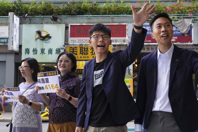 Ứng viên thắng cử của phe dân chủ Kelvin Lam và Joshua Wong vẫy tay, cám ơn sự ủng hộ của cử tri. Ảnh: AP.