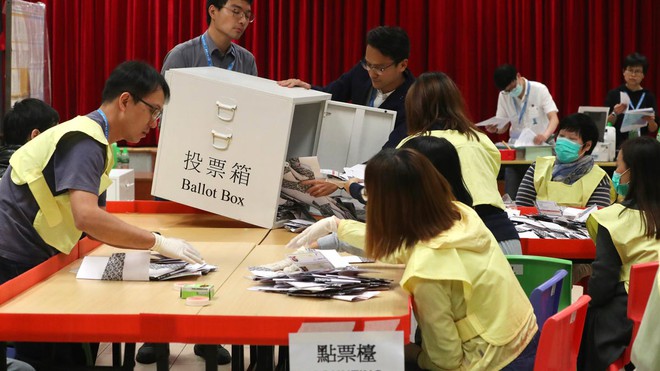 Kết quả kiểm phiếu sáng 25/11 cho thấy các đảng có lập trường thân chính quyền đánh mất lợi thế đa số ở hội đồng lập pháp các quận của Hong Kong. Ảnh: Reuters.